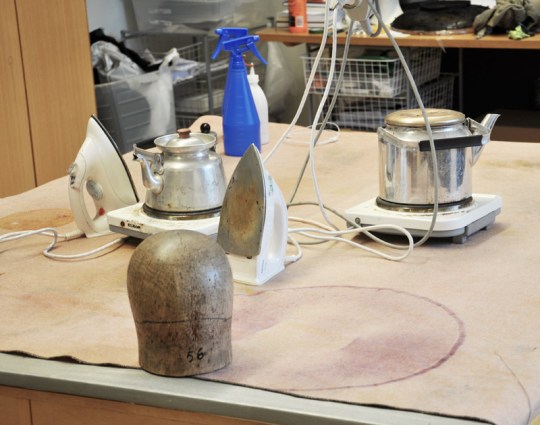 Man använder het ånga för att forma materialet till den hattmodell man valt ut. Till exempel hålla den över kokande vatten och sedan forma den, så kan man även pressa en blöt handuk mot den med ett varmt strykjärn. Det var otroligt spännande hur seg och följsam filten blev när den var fuktig. Man kunde verkligen dra den både hit och dit. Men det kändes i händerna efter två dagars maniskt dragande. Jag fick till och med smörja in armarna med ipren-gel för att jag hade sådan träningsvärk. (Ja, jag var en aning manisk)