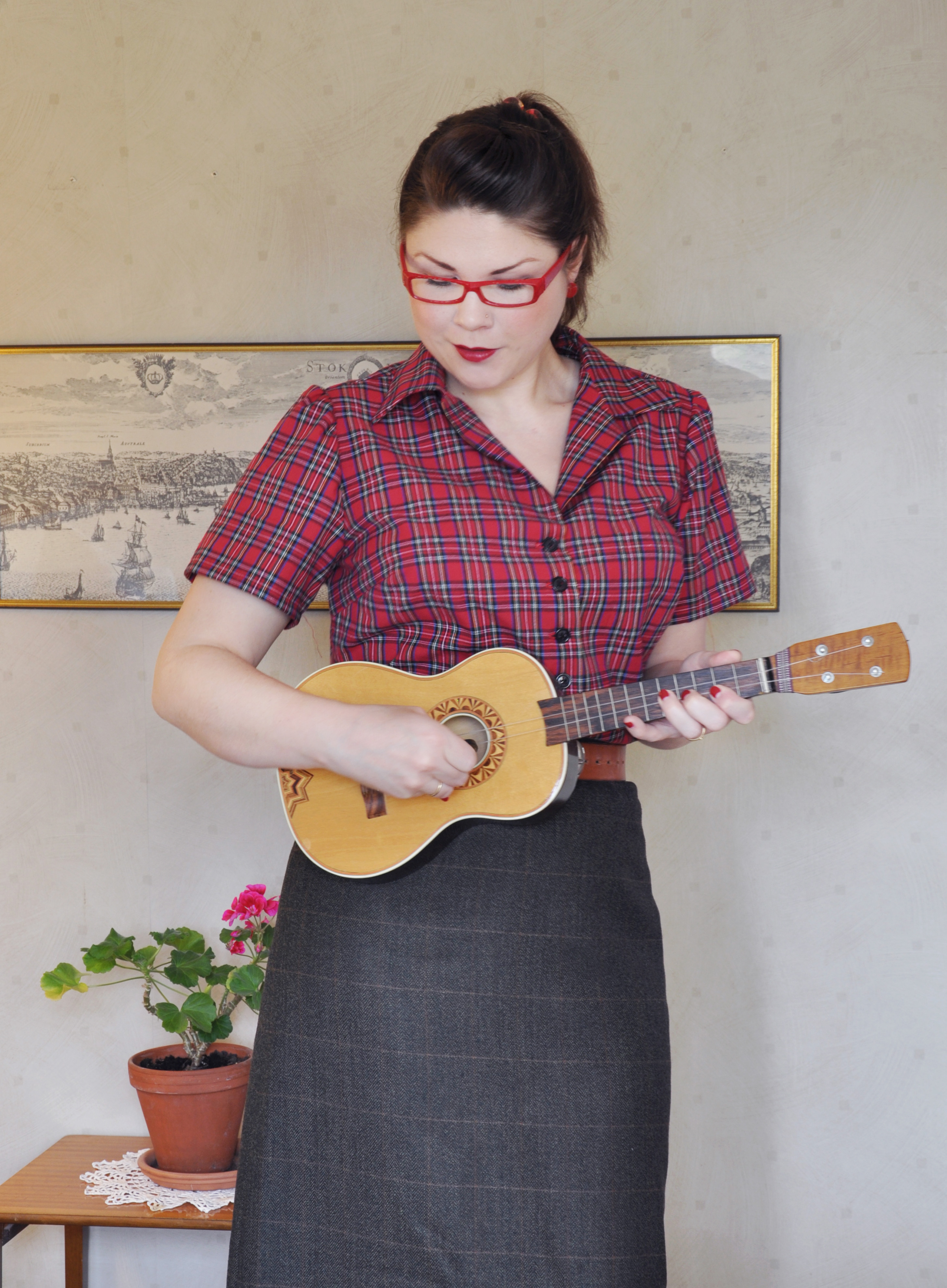 I made this plaid flannel shirt a while ago but didn’t have the time to blog about it. It’s made from a nice and cosy cotton in one of my favorite pattern. Very easy to make and easy to wear. I made a sweet little dress for my niece in this fabric and I’m so looking forward to match next time we meet. I just hope the dear child haven’t grown out of it before then. Those small ones do grow quickly. Oh, yes I’m thinking about learing to play the ukelele. I found this one in the old storage, my mother got it from grandpa when she was a teenager. Being an George Formby-fan it has always been a little dream to know how to play….