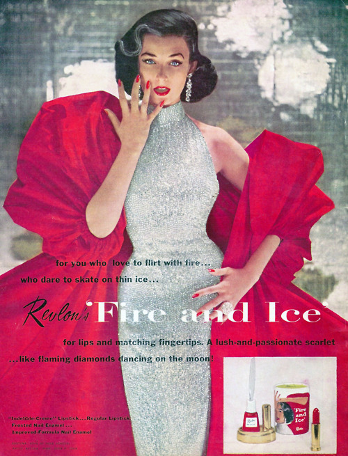 När jag sitter still vid datorn och jobbar brukar jag lyssna på radioprogram på Sveriges Radios hemsida. Programmet Stil är en favorit och idag lyssnar jag på det här programmet om nagellack som sändes den 16 mars. Väldigt intressant och inspirerande att få höra nagellackets historia i Skönhetsindustrin och hur Revlon revolutionerade nagelacksanvändadet genom att lansera många olika färger som förändrades per säsong på samma sätt som modet. Revlon var inte bara banbrytande med sina nya nagellacksfärger utan använde sig av reklam på ett nytt sätt, en av de mest uppseendeväckande reklambilderna, en reklamklassiker kan man kalla det, är Revlons ”Fire and Ice” från 1952. Otroligt snyggt med modellen Dorian Leigh i en glittrande paljettklänning och dramatiskt röda naglar och kvinnan hon representerar framställs som en självständig och sexig femme fatale med sina dramatiska naglar. Bilden åtföljdes dessutom av en frågeformulär med ”spännande” frågor där man kunde avgöra om man var material nog för att bära nagellacket.
