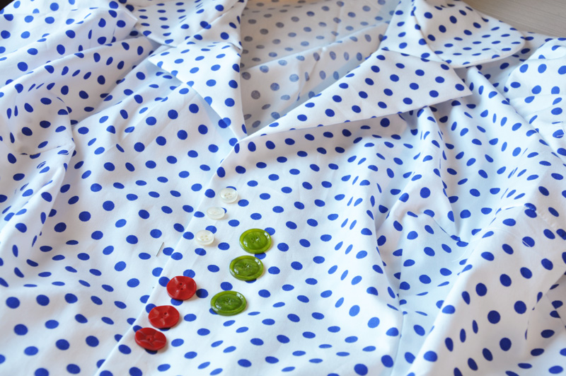 Taking a break in this evenings sewingtime to ponder what kind of buttons I should use. I always get problems here. I just have trouble deciding, anything really but buttons in particular. Which button, which button.. Gaah! I think I’ll take the safeway and go with red. Red, white and blue is the classic combo and I have always liked it….