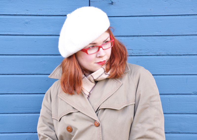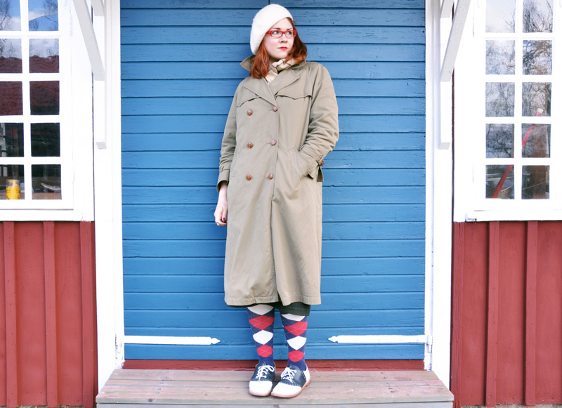 Eftersom det var kyligare idag blev det trenchcoat med det varma fodret i kamelhår isatt och basker på huvudet. Trenchcoaten är ytterligare ett vinds-fynd som jag renoverade lite innan den var i användbart skick. Renoveringen bestod i en rejäl tvättning och lagning av alla knapphål som hade trasat upp sig. Jag fick verkligen träna på mina knapphålsstygn och framåt det sista knapphålet såg de faktiskt rätt prydliga och fina ut.