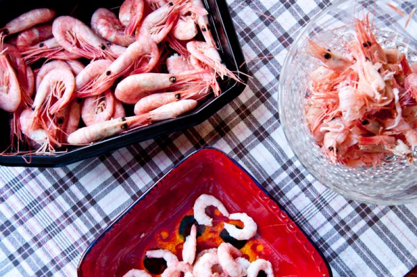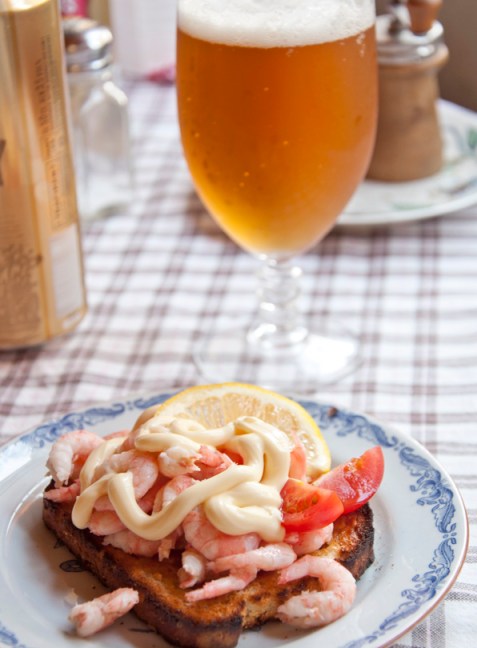 När vi kom hem var vi både utsvultna och trötta. Så vi skyndade oss att göra en räktoast till förätt som sköljdes ned med en kall öl medan laxen gjordes i ugnen. Färska räkor är verkligen en favorit, även om jag tycker det är lite träligt att skala dem. Tänk att min farfar kunde skala räkor med kniv och gaffel! Han hatade att bli kladdig om fingrarna så han hade lärt sig hantera räkor med bestick, och gjorde det lika snabbt (om inte snabbare) än vad vanliga människor skalar med fingrarna.