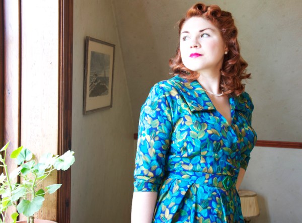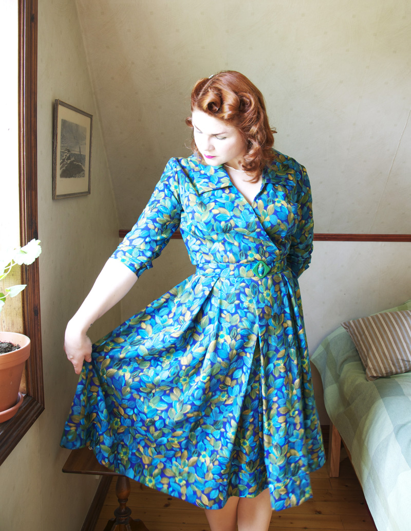 En av klänningarna jag hittade i mormors hus krävde lite förändringar innan jag kunde använda den, det var ärmarna som var lite obekvämt trånga. En sak som jag verkligen älskar med kläder från förr är hur man tänkte när man sydde dem. För det här är en av de hemsydda, både gammelmormor, mormor och mamma var väl bekväma med symaskinen en stor del av garderoben var hemsydd. Det är nästan alltid en rejäl sömsmån i kläderna vilket gör att man kan med ganska enkla medel lägga ut dem där det behövs. Allt jag behövde göra för att klänningen skulle sitta som en smäck var att sprätta upp ärmarna och sy ihop dem igen, fast den här gången två centimeter större. Skärpet som fanns till hade inget spänne men det gjorde inget, för jag råkade ha ett alldeles perfekt grönt bakelitspänne som jag sydde fast istället.