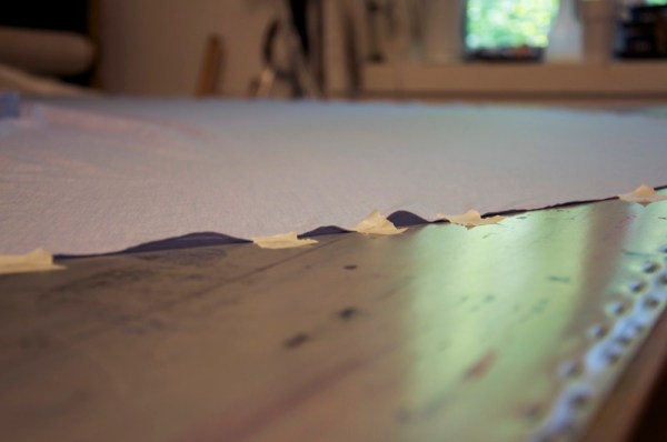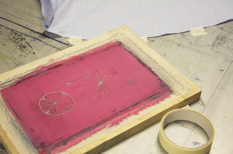 De senaste dagarna har det varit fullt upp och jag har varit speedad som bara den för att hinna med allt. Bland annat har det varit en intensivare period av tryck som stått på agendan. Tejp är ens bästa vän när man trycker, det är alltid minst lika stor del av förberedelse som ligger till grund om det ska bli bra. Häromdagen var jag lite för hetsig och fick totalt hjärnsläpp så jag glömde tejpa schablonen (för att färg inte ska läcka i kanterna). Så jag sprang som en yr höna i tryckrummet och försöka lösa situationen bäst jag kunde, givetvis ringde telefonen samtidigt (jag svarade inte men blev stressad ändå) och jag hittade inte tejpen (som låg mitt på bordet om man tittat ordentligt). Det blev bra ändå, men mammas ord om att man måste vara samlad och tänka sig för när man trycker ringde i öronen å det bestämdaste.  Det här är ännu en cirkelskuren kjol som jag tryckte en bård på längst ned. Det blev rätt bra faktiskt, det enda som störde mig var att färgen inte riktigt uppförde sig som jag tänkte vilket berodde på tyget (som inte var ett tryckförberett tyg, vilket innebär att det kan finnas beredningar i tyget som påverkar hur färgen lägger sig på fibern.) men på det stora hela blev jag väldigt nöjd med resultatet.