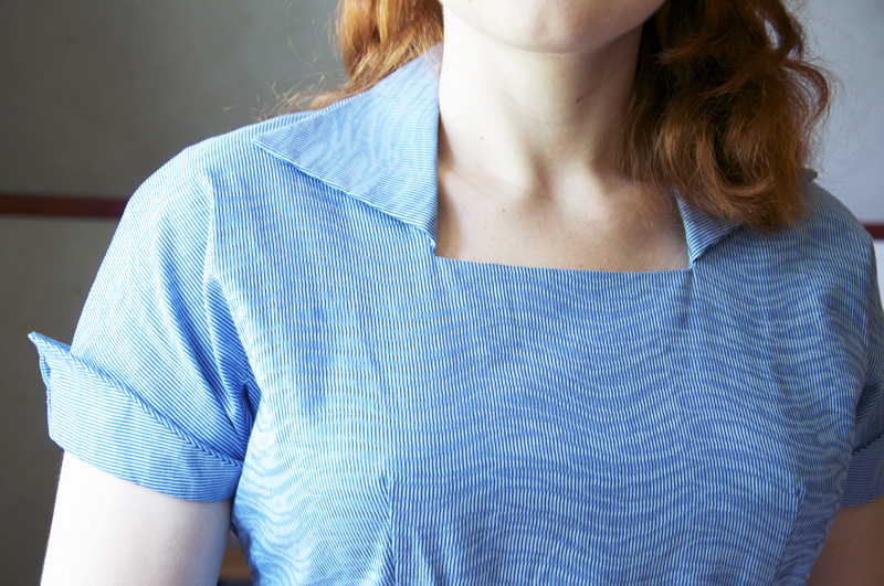 För att ge mer rymd åt denna korta snäva kimonoärm som annars skulle varit väldigt trång har man sytt i en besparing i armhålan. Här kan man läsa en bra beskrivning om hur man gör det. Jag har länge varit intresserad av hur man gör detta och nu när jag kan titta på den här som förlaga kommer jag nog lättare ta mig i kragen och prova på det själv. Det syns inte så mycket men dragkedjan i sidan är väldigt kort och man drar den dessutom åt ”fel” håll. Den öppnas alltså nedåt och under skärpet sedan satt det två tryckknappar och öppningen under det doldes under vecket. Vilket otroligt smart sätt att vara sparsam på, eftersom dragkedjor är dyrt är det klart viktigt att lyckas komma undan med att använda så kort så möjligt. Sådan här sömnadskunskap är guld i mina ögon, tänk vad man tänkte efter förr. Även om 50-talet gick in i en välbeställd högkonjunktur hade man fortfarande kvar tiden då det var skralare i minnet och sparade närhelst man kunde. Vad jag önskar det kunde vara så fortfarande.