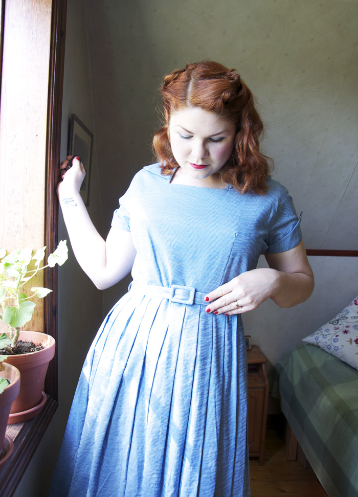 Jag nämnde en ny klänning i förra inlägget och här är den i all sin prakt. Det är inte ofta jag får tag på vintage-klänningar som passar mig då jag är både rätt bystig och har för lång rygg för de flesta klänningarna därute . Men nu på senare tid har jag på olika sätt utökat min garderob med hela tre nya (kors i taket!) och alla i olika typer av blåa nyanser. Märkligt nog är det också min nyaste favoritfärg och det är bara att tacka och ta emot antar jag. Den här godbiten skall jag vårda ömt och jag kommer anamma en hel del av detaljerna från den i min framtida sömnad. Förmodligen kommer jag nog kopiera den helt vad det lider. För jag tycker verkligen den är helt underbart fin.