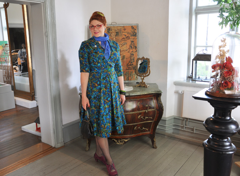 The sunday was spent at the museum in town. I donned the blue woolmuslin-dress since the wind was a bit chilly (can’t believe it’s june and still so cold weather). I had done my hair in a new style using a hair-donut. I’m not sure on how comfortable I am with this more of a 60s style. But I thought it proper since the dress probably was made in that era, I think it has the look of the 60s anyhow.