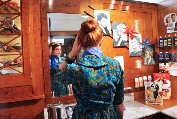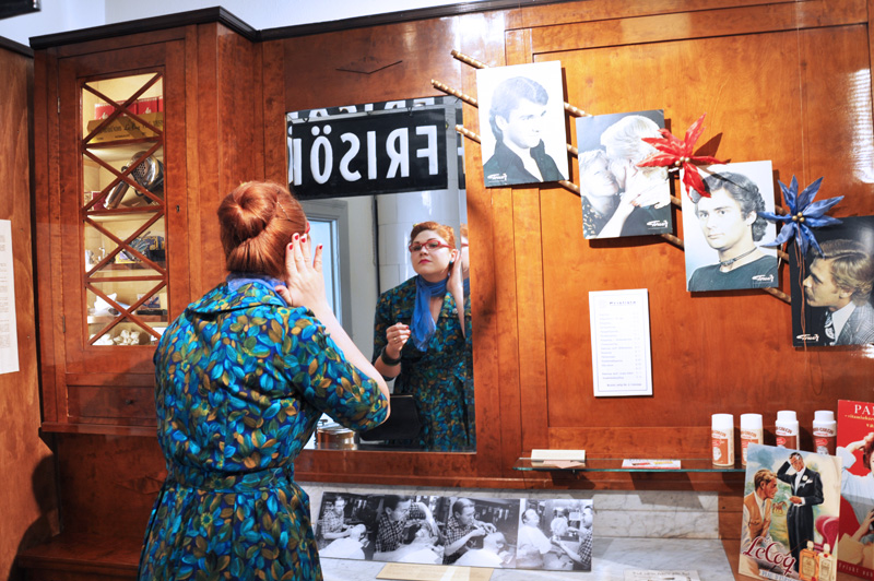 Vi gick och titta på utställningarna och jag passade även på att köpa mer tablettaskar. De där viol-godisarna är ju vanebildande. Bland de permanenta utställningarna visade de bland annat upp inredningen från en gammal frisörsalong från staden som lades ned för några år sedan. Jag passade på att spegla mig lite. Jag provade dagen till ära ett nytt sätt att fixa håret eftersom jag inte orkade göra pincurls över natten. Med hjälp av en hår-donut gjorde jag en stor bulle uppe på skulten. Jag vet inte hur bekväm jag är i denna lite mer 60-tals inspirerade frisyren, men det kändes lite passande till klänningen som förmodligen är en 60-talare.