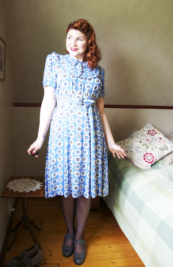 This is the dress I got last saturday, an early 40s dress in a slinky rayon that I just love. I’m on a big rayon-binge right now. It really is the most spectacular type of fabric. The old types of rayon is of course the best, even if one have to be a bit careful and make sure it hasn’t become fragile due to age. What about the dress then? I just love the frilly ruffled parts at the chest, and the button up neckline and the shoulderpads, I heavent worn shoulderpads since the early 90 so it’s due….This dress is going to be the inspiration to many of the dresses I’ll make in the future I’m sure.