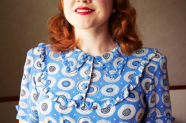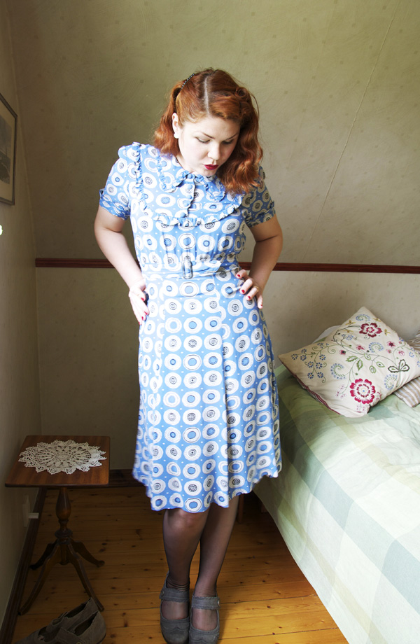 Okej, nu fastnade jag ju rätt rejält på rayon-spåret. Klänningen då? Jag får kommentera den kort. Jag älskar detaljerna vid ringningen, det lilla rynk-ryschet, knapparna, axelvaddarna (senast jag hade axelvaddar var på någon skolavslutning under tidigt 90-tal), tyget i klänningen är helt underbart, färgen, mönstret, fallet. Det enda som finns att klaga på är att den faktiskt är lite kort i livet så midjan hamnar lite väl högt upp, speciellt när man rör sig lite.. Så kanske den är lite i kortaste laget. Dessa saker påverkar dock inte min förtjusning över klänningen, som den äldsta klänningen i min än så länge lilla vintage-samling kommer den få en upphöjd status oavsett och den kommer garanterat få agera inspirationskälla till flertalet klänningar som jag kommer sy, det är jag övertygad om.