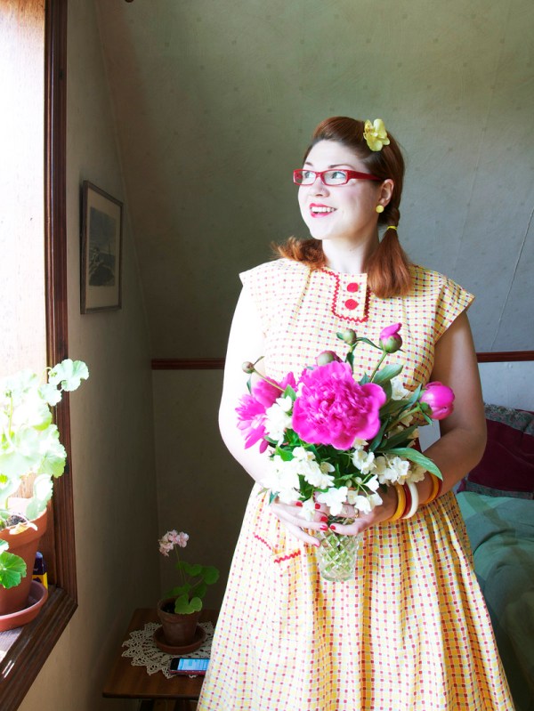 I just love strong colors in what I wear, gone is the day where black was favored (like when I in my teens loved Depeche Mode and died my hair black and purple). I wore this dress yesterday as a suitable midsommernigths eve-dress and I realized that I only worn it once since I made it. A shame indeed since it’s a rather nice dress, made from a small piece of thrifted cotton, adorned with ric rac and buttons sporting a small pocket in front. Works for both everyday use and more festive occasions, I really have to make more dresses like this.