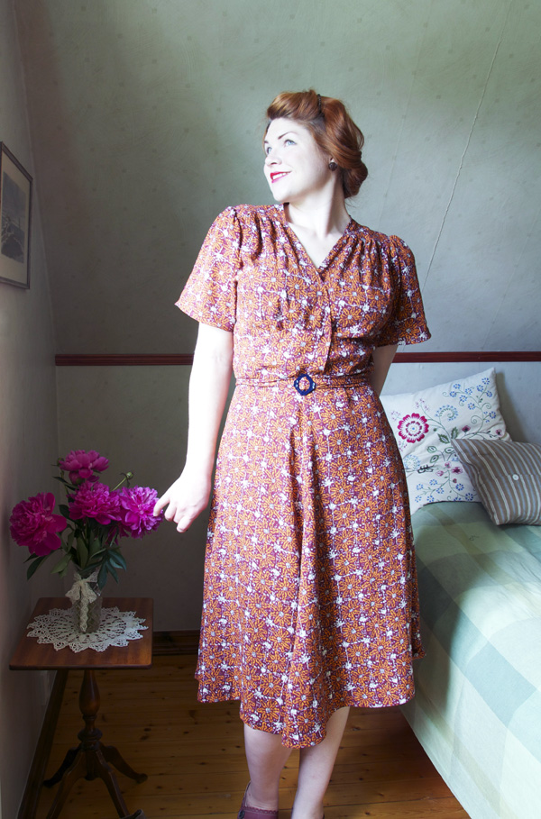 Klänningen är jättefin! Mönstret är oerhört likt detta: http://sensibility.com/blog/patterns/1940s-swing-dress-pattern/