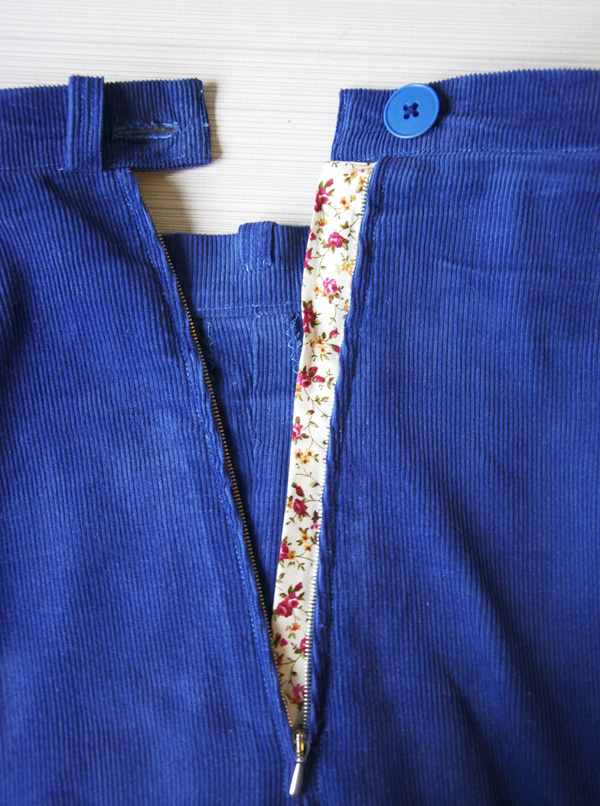 Jag gjorde kjolen ganska tight men ville jag inte att dragkedjan skulle ligga oskyddad mot huden (det är ju rätt hemskt att klämma sig i dragkedjor), så jag åtgärdade det med en liten bit blommigt bomullstyg på baksidan. Jag tyckte det blommiga blev en fin kontrast till det blåa, nu syns det ju bara när man tar av sig och på sig kjolen, men de där små extra detaljerna i underarbetet gör alltid att det känns finare i slutändan.