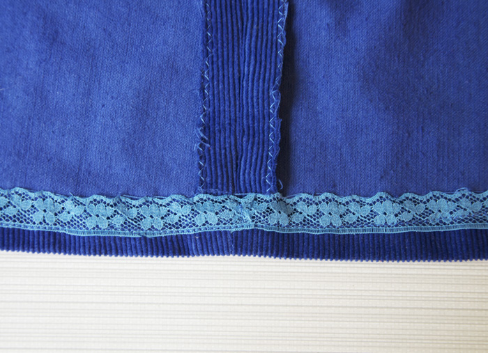 I made this skirt the other week. First I planned to make a pencil skirt with box pleats in the back but after I thought about it I realized that the corduroy probably to thick to get the creases t0 look good. Instead I turned the pencil skirt into a 6 gore A-line skirt. And I really like how it turned out. The corduroy was white from the beginning but I dyed it blue (being that blue is my new favorite color). To avoid getting nipped by the zipper I added a piece of thin cotton behind the zipper. I like the contrast between the flowery fabric and the blue look, although not visible when wearing the skirt it ads that extra something I think. Also, I didn’t want to fold the fabric twice so at the bottom hem I added the lace instead, I really like using lace for hemming and will be sure to do that the next time I make something in a heavier fabric.