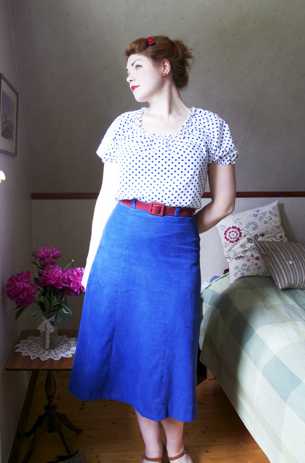 I förra veckan sydde jag den här kjolen i blå manchester. Jag hade först tänkt göra det till en rak pennkjol med veckplatta i bak, men efter lite eftertanke kände jag att manchestern var lite för tjock för att kunna vikas snyggt. Så istället gjorde jag om pennkjol-mönstret till en sex-vådig lätt utställd kjol. Jag blev väldigt glad i resultatet och kommer garanterat göra fler, för det finns ju inget behändigare plagg än A-linje kjolar.
