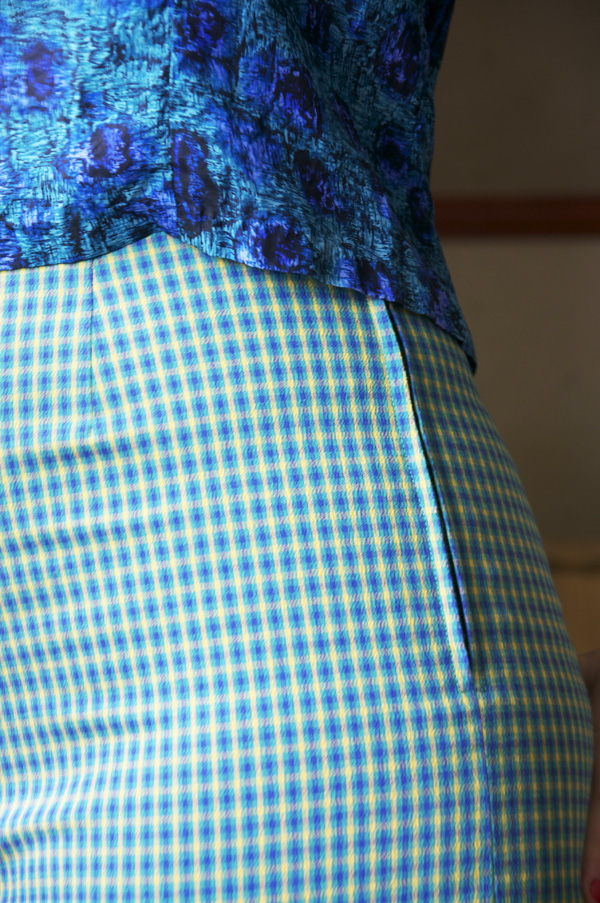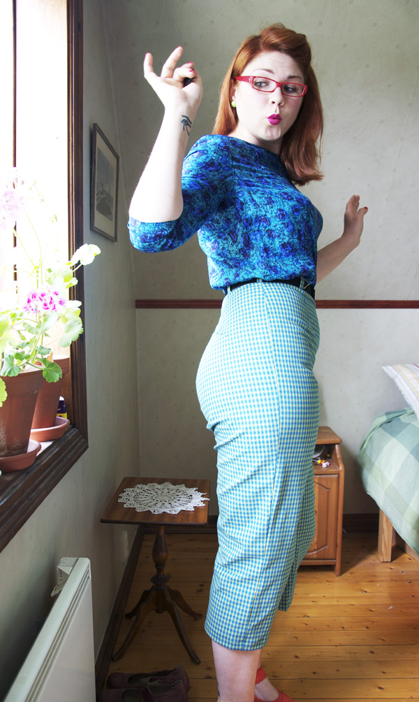 Jo, jag tar ju faktiskt på mig byxor ibland, även om det inte är allt för ofta. Men eftersom jag har dykt djupt ned i hästintresset igen kändes det som läge att damma av mitt gamla byxmönster för att göra ett par ”pedal-pushers” eller pirat byxor eller vad man nu ska kalla dem. Detta för att se vad som kan tänkas behöva förändras för att göra ett ridbyx-mönster så småningom. De här sydde jag häromveckan i en stretchig mediumtjock bomull som jag köpte förra året (då när jag köpte upp nästan hela lagret på tyg-outleten några mil härifrån). Jag velade fram och tillbaka länge över vart jag skulle sätta dragkedjan. I sidan med risk för att höftsvängen skulle göra dragkedjan ”bubblig” eller mitt bak (vilket inte kändes helt rätt heller) vilka båda är helt tidsenliga alternativ, slutligen blev det ändå sidsöm och jag är nöjd med valet. De förändringar som behövs innan det kan bli ridbyxor är bland annat en liten höjning av grenen och så småningom skall det även bli en modell med en ökning vid låren för de klassiska ”ridbyx-låren”, även om jag tänkte börja med en lite modernare variant först för att prova in modellen. För jag misstänker att det kräver några provmodeller då ridbyxor ändå måste vara främst funktionella även om man givetvis också vill att de ska vara snygga. Eftersom jag nu är inne på byxsnåret så kommer det garanterat bli både jeans och ännu fler lätta bomullsbyxor som de här gjorda. Införskaffat är redan jeans-nitar och krämfärgad tråd för stickningarna för ett par klassiska retro-jeans med hög midja. Åh, härliga byxglädje, tänk att man kunde vara så insnöad på kjol och klänning att man glömde bort att byxor också kan vara rätt okej.