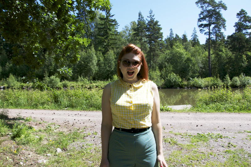 Igår var det strålande fint väder och för första gången på länge kändes det som riktig sommar. Vi passade på att ta en lång cykeltur på kanalen och jag provade in mina nya byxors cykelvänlighet. Det visar sig att det är ypperligt att ha på sig byxor när man cyklar. Se där ja! Till det hade jag en gammal blus som var ett av de första plagg jag sydde till mig själv. Vad länge sedan det känns nu (typ 10 år kanske) och ändå används den fortfarande rätt mycket. Det enda felet på den är att kragen inte riktigt ligger rätt, men vad kan man begära av de där första grejerna egentligen?