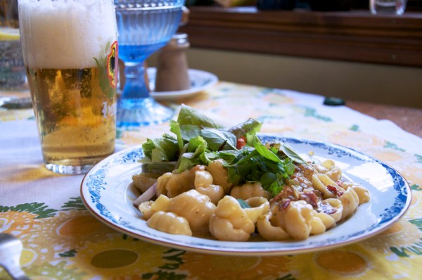 Pasta Carbonara med hemodlad sallad och gröna örter (basilika och persilja). Det var otroligt gott med en sådan mastig lunch efter att ha tagit ut sig lite på förmiddagen.Det hela slank ned med ett kallt glas lättöl och  efter det en kopp starkt kaffe och vips var man med i leken igen. På kvällen sedan åkte jag hem till mamma vi tog en lång ridtur i skogen (hittade massa kantareller som vi ska rida tillbaka idag och plocka) och följaktligen har jag idag en rejäl träningsverk lite överallt som gör sig påmind så fort jag rör på mig….