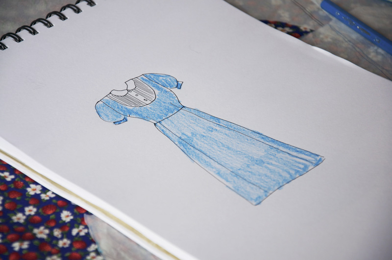 Så sitter man där i syrummet igen och kan inte bestämma sig. Det blir så för nästan varje grej jag ska göra, att man går igenom ett stadium av total obeslutsamhet och flera timmar går. Grundtanken var såhär. En klänning med sexvådig kjol, med puffärm och vitt bröstok med biesenveck och så en vit dock-krage. Sen kom jag på att lite rynk kan ju vara snyggt att slänga in i det hela någonstans, exempelvis vid sidan av biesenvecken. Efter en test kände jag dock att rynk plus veck kanske blev lite för mycket. Den idén får vänta till något annat, men så snart jag bestämt mig angående det testar jag biesenfoten på en bit av det blå klänningstyget och inser att veck är rackarns snyggt på mönstrat också. Tvivlen hopar sig. Ska jag kanske strunta i bröstok och istället göra en skjortblus överdel med biesenveck på vardera sida om knäppkanten? Vit dockkrage är ju väldigt snyggt när det står i kontrast till ett mörkare tyg. Det är träligt det där med valmöjligheter. Ju fler man har desto svårare blir det men trots det får man ju vara hjärtligt tacksam över att ha den där gåvan i att kunna välja allt helt själv hur svårt det än är. Om jag bara kunde haft förmågan att bestämma mig lite snabbare hade säkert klänningen hunnit bli färdig idag…