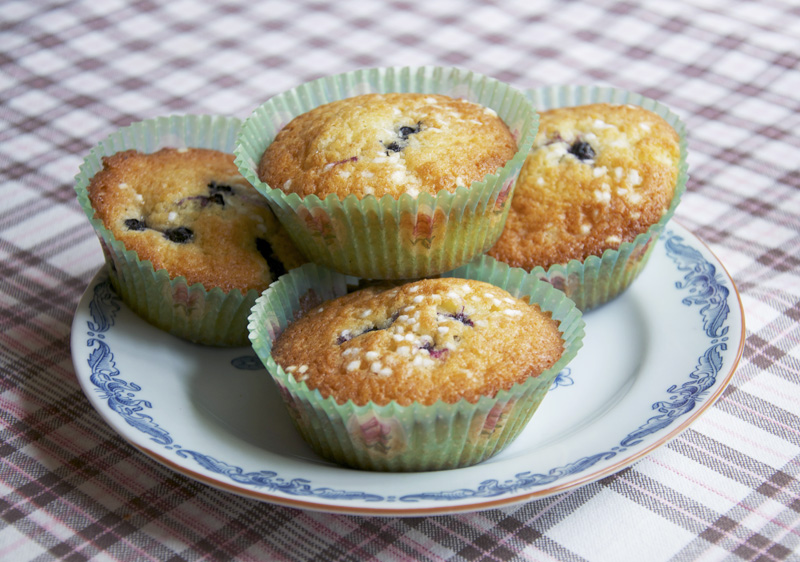 Jag hade totalt glömt vad trevligt det är med muffins. Alltså riktiga, hederliga gamla muffins, inte sådana där moderna stora café cupcakes som man bara orkar halva av innan man storknar (inte för att det är något fel på dem, men jag föredrar nog allt vanliga små när det kommer till kritan)… Idag efter vår sedvanliga söndagsbrunch kändes det som det var läge för någonting till kaffet. Efter en konsultation av ”Sju sorters kakor” stannade det på muffins, och det får jag nog ta och baka lite oftare inser jag. Går ruskigt snabbt att ”bara” slänga ihop och så blir det fasligt gott. Det här är en varitation på receptet ”Fruktmuffins”, och jag tyckte det blev riktigt lyckat. En bra grundsmet som man variera med vad som helst. Idag blev det blåbär och så lite pärlsocker på för att det är fint. Blåbären plockade jag vid huset förra gången vi var där (det finns massor). Gott!