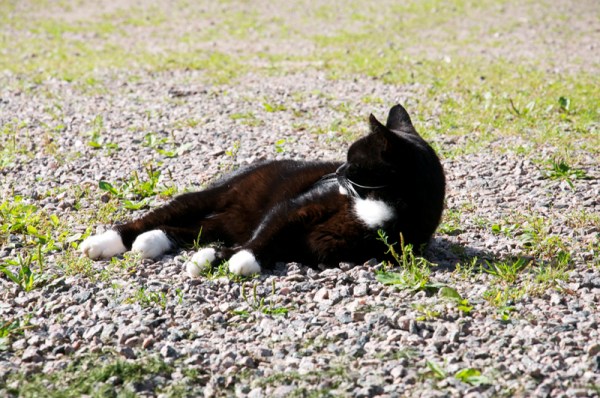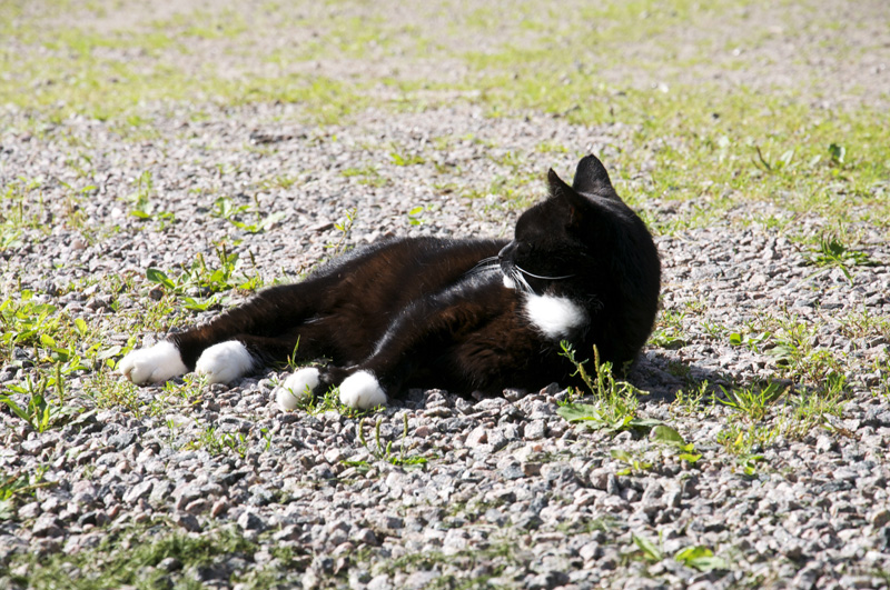 Frasse låg och solade på grusplanen nonchalant som bara katter kan.