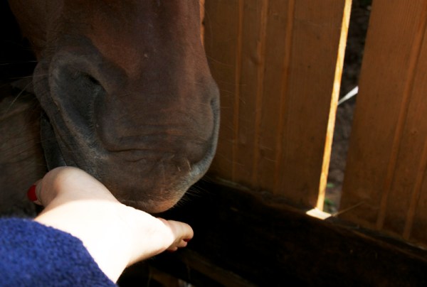 Det var ju en väldig tur att jag hade ätit äpple till frukost och hade en smakbit att ge henne. Det finns få saker som är så bra som hästmular…. Det skulle kanske vara valpmagar då.