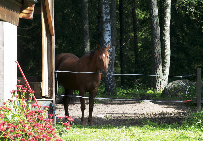 Today when I came to work all the animals where waiting for me. The cat ”Frasse” was spreading out on the drive. ”Ruby” came out from the stable and waited for the treat I usually give her first thing. Of course she got the usual treat, the leftover from my morning apple that I put on my oatmeal. Horses muzzles are the best thing, the next best thing may be the bellies of puppies. ”Bobby” the dog where working on his tan in the sun, he would have liked some apple to, but got a chewing bone instead. One can’t really split an allready small piece of apple between two horses and a dog.