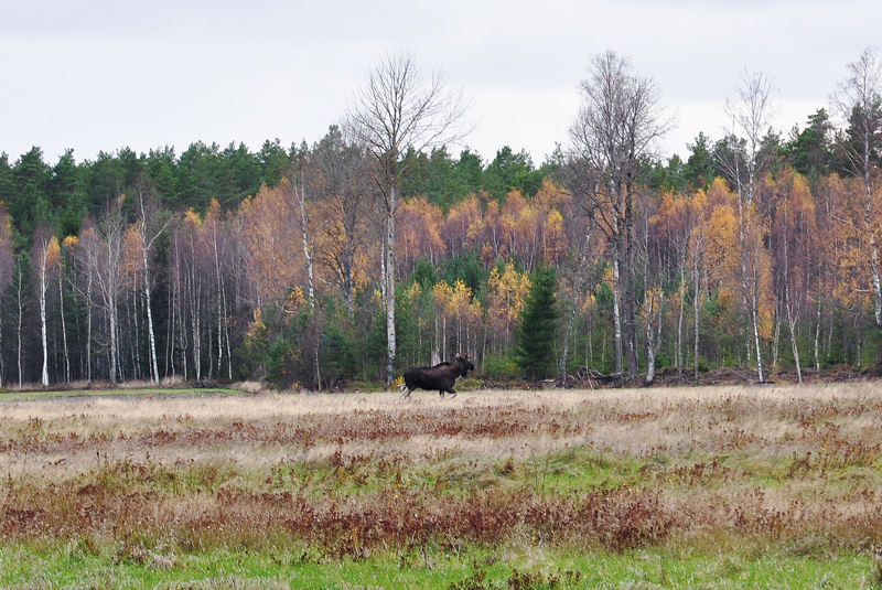Igår när vi åkte ut till huset för att lämna av linouleum-golvet som skall läggas in nästa vecka hajade jag till när jag såg en mörk skugga stå och spana inne i skogen bredvid grusvägen. När jag klev ur bilen vid huset hade han börjat röra på sig och sprang över fältet, vårt fält. Det är ganska stort så jag hann faktiskt få upp kameran innan han kommit till skogen på andra sidan. De som sålde huset sa att djurlivet var rikt och att man ibland kunde få se både älgar och rådjur dricka ur dammen som finns på gården (Man ser den från köksfönstret). Det är till att ha majestätiska grannar, för den här älgtjuren var stor och tjusig. Skogens konung skulle man nästan kunna säga. Jag är glad att han klarade livhanken under älgjakten.