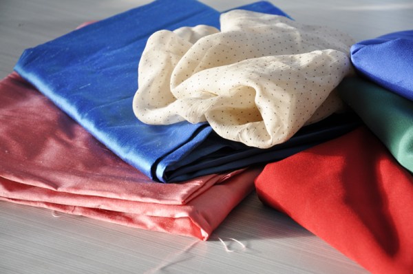 Även denna gång kom jag hem från mässan med en del godbitar i resväskan. Jag gick lite överstyr hos Simbra sidens monter, kanske lite. Men åtskilliga hundralappar senare är jag mycket mer härligt sidentyg rikare. För jag köpte fyra olika crepe de chine (till höger) som jag tänkte ska bli slinkiga blusar i 30/40-tals stil. Jag älskar känslan i att låta ett fint crepe de chine glida mellan fingrarna, svalt, slinkigt, mjukt och bara alldeles underbart. Så slog jag till på två stuvar dupion-siden (till vänster) de ska också få bli blusar, även om jag inte tänkt ut någon speciell stil på dem än. Den lilla biten chiffon crepe fick följa med av bara farten, det såg så sober ut i sin dova krämfärg med de små prickarna, jämfört med allt det andra som var så färgglatt. Det är bara att fålla den sen är det en fin scarf färdig för hösten.