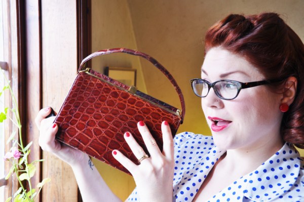 Det är märkligt vad lite påfyllning av hårfärg kan göra. I söndags tog jag tag i saken och fixade min utväxt och bättrade på lite i det röda (som ju dessvärre är en färg som bleknar ganska snabbt). Den här gången blev det lite mörkare än sist och även om det inte var riktigt meningen så kändes det väldigt rätt med en djupare nyans röd på svallet såhär i hösttider. Laddad med ny färg och pepp över att göra något annat än tänka på husrenovering åkte jag och mamma ned till Göteborg för ett spännande affärsmöte. Det är alltid lite extra roligt att fixa frisyren när det är nyfärgat. Det blir alltid lite snyggare då, men så förstås gör ju färgen att mitt hår (som annars är ganska så glatt och slinkigt) blir lite mer lätthanterligt och det underlättar ju. Eftersom det var lite regn i luften drog jag på ett hårnät, det är det bästa knepet för att få frisyren att funka även i ett blött klimat som vårt är nuförtiden. Jag tog även tillfället i akt att inviga min finfina födelsedagspresent jag fick av maken. Han vet vad jag vill ha och denna tjusiga krokodilväska var ett väldigt trevligt tillskott till samlingen. Jag älskar verkligen handväskor, speciellt när de är av den här fyrkantiga typen, med mockafoder och perfekta fickor att ha läppstift och mobil i. En retro-pingla kan enkelt inte ha för många handväskor, det är ett som är säkert!