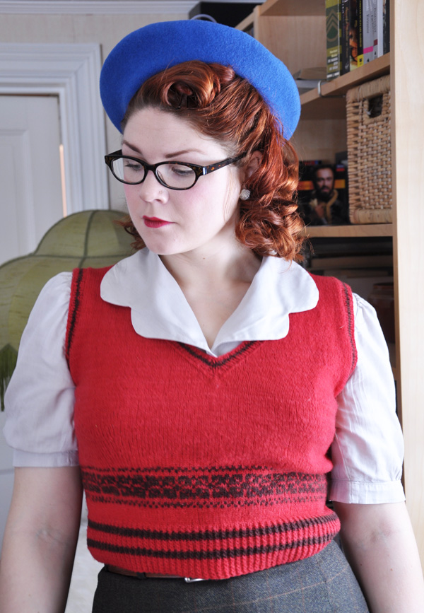 Today I was going to town for a meeting an decided to wear my new blue beret that I got from my husband as a christmas present. Ever since I changed the hair to red I’ve had a new feeling for colors and blue has quickly become a new favorite. It was a bit chilly outside so I decided to wear two layers of knit and took this little vest under my usual knitted cardigan. The pattern is made by yours truly and the model is my mothers. It’s made from a supersoft baby merino wool that we had planned to launch this year but decided to wait a bit with. The cat was sleeping in the happily in the chair in the living room when I came down and disturbed him with my camera. I haven’t found witch places that are the best for taking pictures in the house yet so it’s a lot of moving the camera around trying different lights. The black coat is my favorite for winter, have worn it several years and still it hardly looks worn. That truly speaks of the quality that they made in the olden days. When clothes where made to last…..