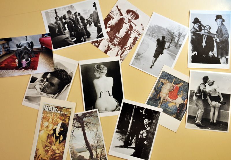 De vita hyllorna stod i huset när vi köpte det. De fick vara kvar även om jag kanske drömmer lite om en fin gammal teakbokhylla så tror jag nog de här får bestå ändå. Det är liksom inte mycket väggplats att jobba med eftersom det är snedtak och på motsatta sidan finns en trevlig gammal inbyggd garderob som förvarar mina stuvbitar ytterst tillfredsställande. Teakbokyllor kanske man får fylla vardagsrummet med istället, där väggytan är lite mer generös. Väggen ovanför mitt tillklippningsbord känns dock väldigt bar och jag kom på att jag har en fin samling med vykort som skulle kunna göra om den tomma väggytan till en inspirations-vägg. Nu är frågan bara hur jag ska ordna upp det. Jag vill ju inte sätta nålar i mina fina vykort. Kanske skulle sätta upp trådar och fästa dem med sådana där små miniklädnypor som jag sett någonstans? Eller ska man rama in dem kanske och sätta upp som tavlor? Det där får jag nog allt klura på ett tag till…