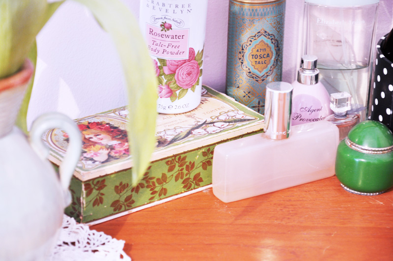 Det blir favoritsakerna som ställs upp på bordet. Som den gröna pappasken som det en gång legat tvålar i som jag fått av min egen mormor. Så får förstås parfymerna trängas tillsammans med diverse andra skönhetsproduker. Jag är mycket för blommiga dofter, som Marc Jacobs parfymen Blush som nästan är slut. Den mest perfekta jasmin-parfymen i mitt tycke och självklart är flaskan rosa.