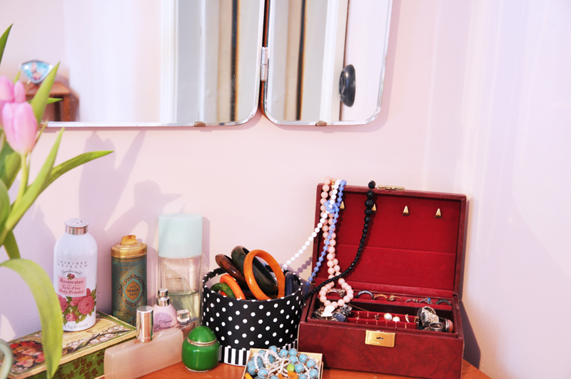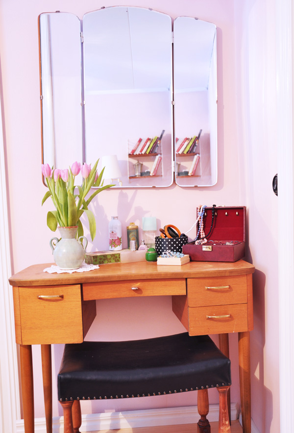 I finally put up the mirror to the dressing table from my husbands grandmother. It has been tucked away in storage waiting for some mending and above all the right place stand. I have been longing to use it and now that time is here. I just love pink tulips, works quite well with the pink bedroom walls. My favorite smells are ”flowery”, like that perfect jasmine-perfume Blush from Marc Jacobs… And of course the bottle is pink!