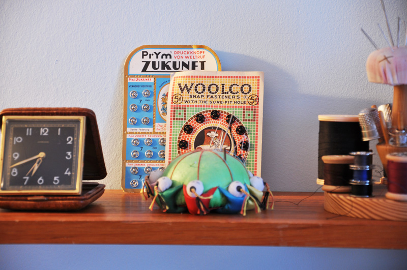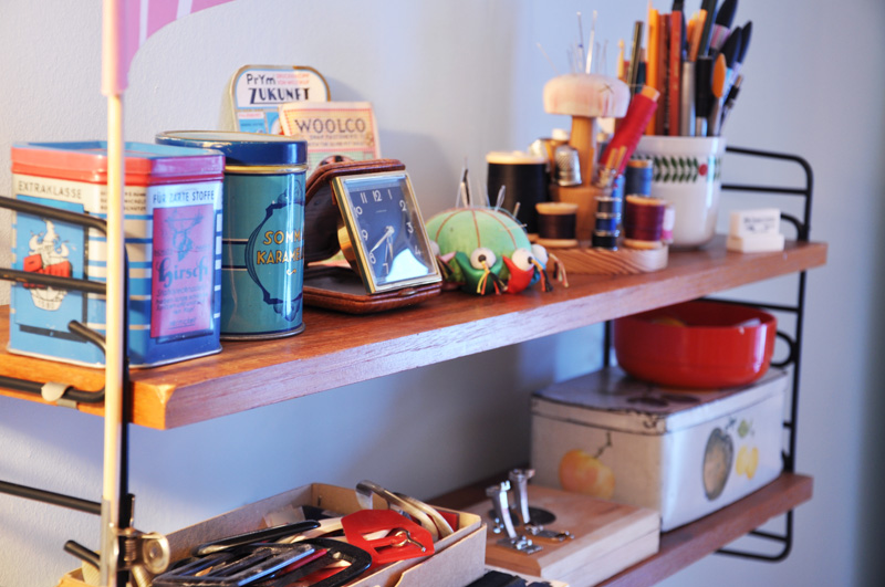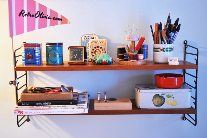 Idag hade jag äntligen tid att fixa och dona ännu lite mer i syrummet och snabbt har det blivit ett riktigt favoritställe i huset. På väggen ovanför arbetsbordet där jag har min symaskin sitter nu en finfin stringhylla som välbehövligt nog svalde en hel del pryttlar. Jag mixade lite med både sånt som jag vill ha nära till hands när jag syr och sådant som jag blir inspirerad av. Jag verkligen älskar gamla sybehör. Som de där kartorna med tryckknappar, tänk om designen på varor såg ut mer sådär nuförtiden. Då skulle jag bli glad. Den rosa vimpeln gjorde jag innan jag åkte på vintagemässan i Örebro förra året, först tryckte jag min logga på det rosa tyget, sedan strök jag fast ett ganska kraftigt mellanlägg för att ge stadga. Närhelst man behöver pepp är det bara att flagga lite åt sig själv. Nästan lika effektivt som att köpa tulpaner. I cigarrlådan har jag mina symaskinsnålar och asken bredvid den var en gång i tiden gammelmormors sybehörslåda. Traditionen går vidare och nuförtiden är den fylld till bredden med trådrullar, nålar och lite allt möjligt smått och gott.