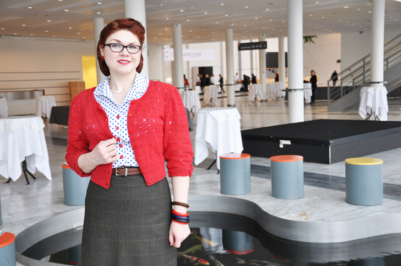 Jag hade på min favoritstass. Pennkjol, blus och kofta.