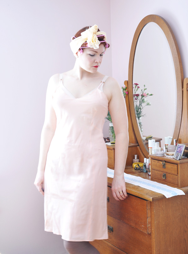 / Of course I had to show the rayon slip in action aswell as to just on a hanger. There’s something special about pastels and the pink bedroom walls looked especially lovely in the morning light, matching the slip quite well I think. When I was unpackning the movingboxes I found several packs of foam rollers that I purchased when I was in London the last time. After a long period of preferring pin curls I felt like giving them a try. A fancy pink and of course that matches the other pastells quite lovely./