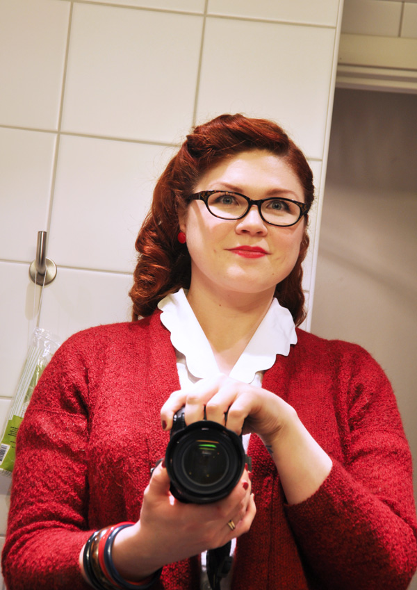 Jag körde lite mer 30-tals inspirerat i en vinröd kofta med sjalkrage. En otroligt fin kofta som jag återupptäckte i vårt sortiment, hade totalt missat den eftersom man lätt blir blind och bara ser sina gamla favoriter. Den heter Hanna och finns i stickhäfte nr 7 om någon vill sticka en egen.