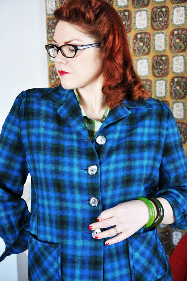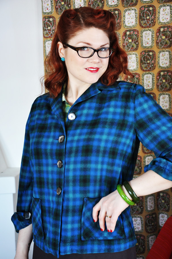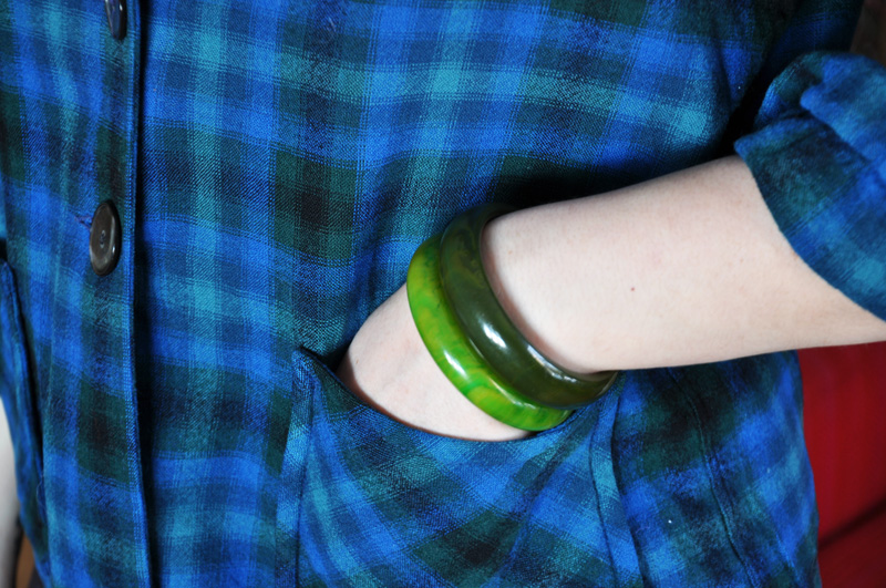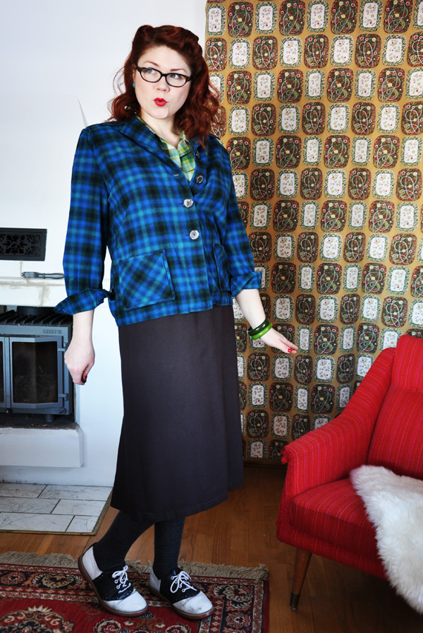 /Finally I have my 49er jacket from Pendleton that I have been coveting for so long. Last week when we where in Stockholm we swung by the store Americana where this puppy was waiting for me to try on. And sure, it fit! A little short in the sleeves but that don’t matter if I have them turned up. And now of course since I love this one, I have to have more. I just love the casual fit, the lovely plaid wool and the accentuated shoulders. Since I did the american style of course I had to wear my old saddle shoes as well. They are pretty worn but in my book that only makes them nicer. The bakelite bracelet in light green I got from my mom that purchased it in the early sixties, the darker one is an ebay-find. /