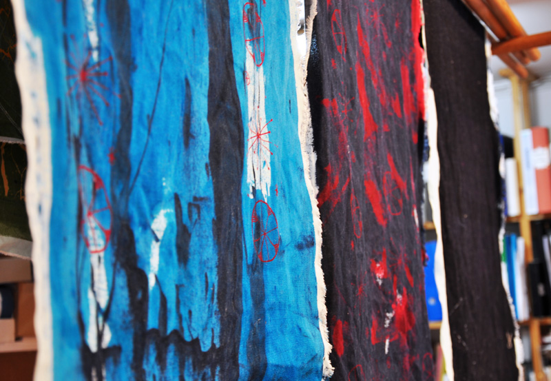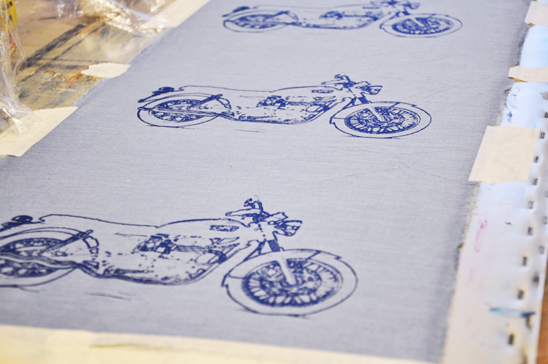 /We try to have printing on the schedule every thursday and friday. Today I did some motorcycles that are to be made into trays for the summer sales. I also washed the experimental prints I did the other week. It was prints with reservation. That is, first I did a pattern layer with one dye and then I printed over it with another dye that didn’t like the first dye. So the color wont fix there and instead the pattern will, making the color stand out and not be in layers. A very fun we had and the prints turned out very nice. I think I will make pillows of the printed fabric a nice addition to the sofa perhaps./