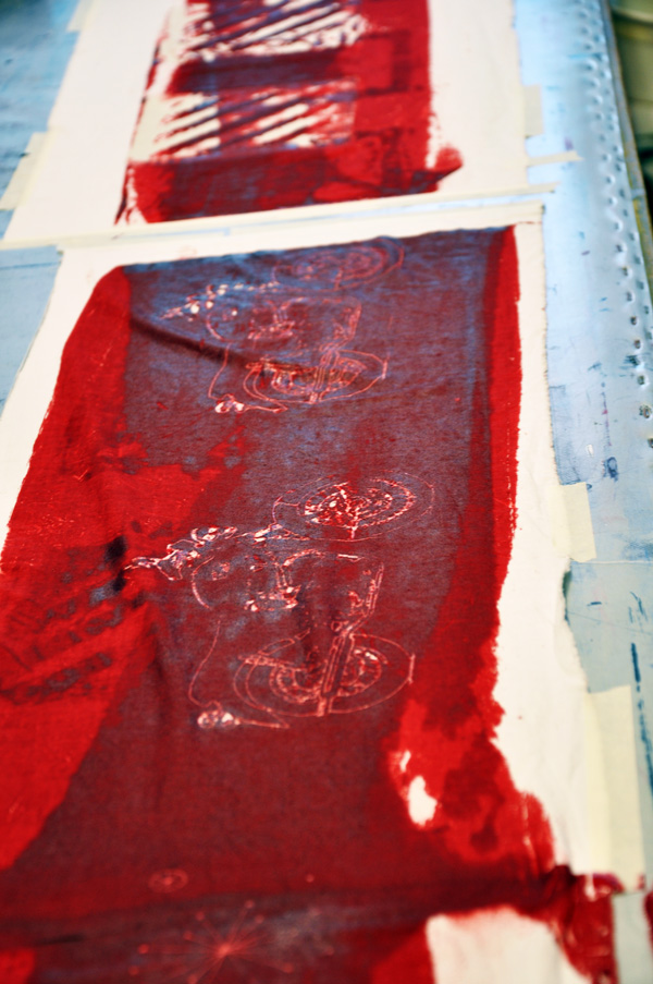 /We have a tradition to have friday-breakfast at work. I come extra early without eating at home and then mom and me eat together in the studio. Bobby is very interested in these friday-breakfasts. We keep on with the screen print lessons and yesterday it was mechanical reserve. The ”gummi arabicum” looks yummy, but of course I wouldn’t eat it, not that I couldn’t as many foods contain it but then it isn’t prepared in our messy dye-kitchen. I went with deep red, and wondered if I’ve been watching to much of Dexter theese last couple of days. But then again bloodred is a very nice color./