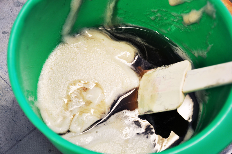 Jag blandar Gummi arabicum och tycker det ser frestande gott ut. Jag skulle ju visserligen kunnat äta det (det är ju sånt man gör sega godisar av till exempel), men kanske inte utan smaksättning och definitivt inte tillblandat i vårt stökiga färgkök.