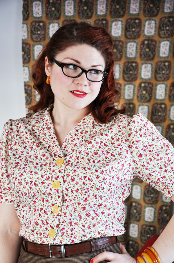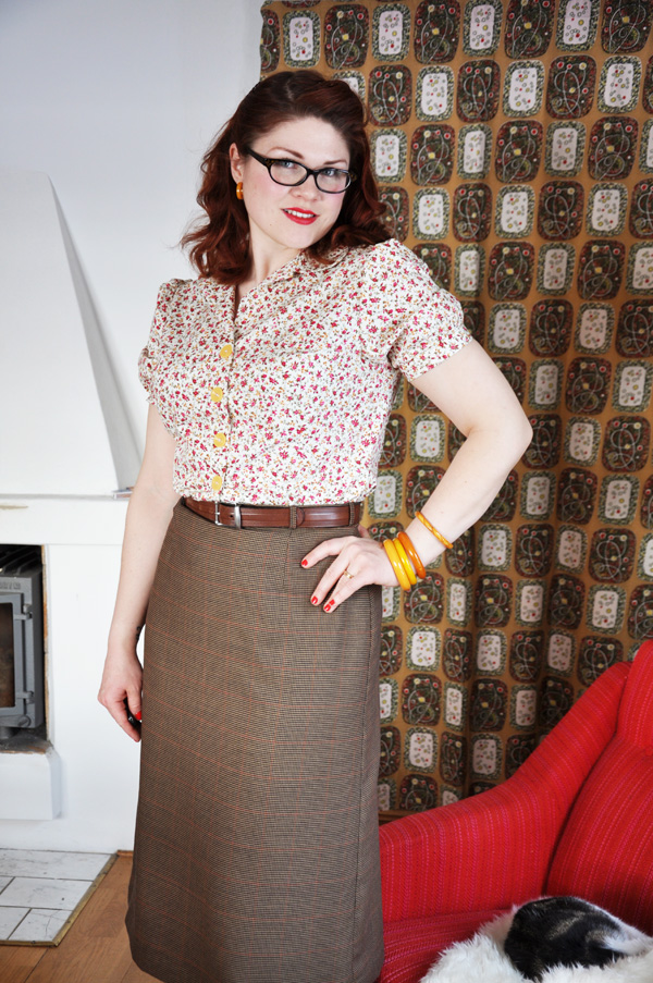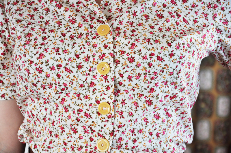 Blusen som jag gjorde färdigt i veckan fick bli en påskaftons-blus. Blommigt, ljuvt och de gula knapparna blev pricken över i. För att vara extra matchande tog jag på mig mina bakelitsmycken i gula toner. Pennkjolen jag gjorde häromveckan passade även den väldigt bra till den nya blusen och jag måste erkänna att det känns väldigt uppfriskande med lite tillskott i vårgarderoben. Glad påsk!