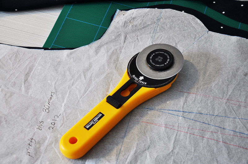 Och så slutligen ett tips! När man ska klippa till tunna och slinkiga tyger som lever lite sitt eget liv som till exempel rayon har en tendens att göra. Istället för sax använder jag då min rullskärare. Väldigt praktiskt och kanterna på tyget blir raka och fina. Se bara till att inte skära fel, för kniven är vass och se till att inte skära utanför underlägget så kniven blir slö. För det finns ju inget mer irriterande än slöa verktyg.