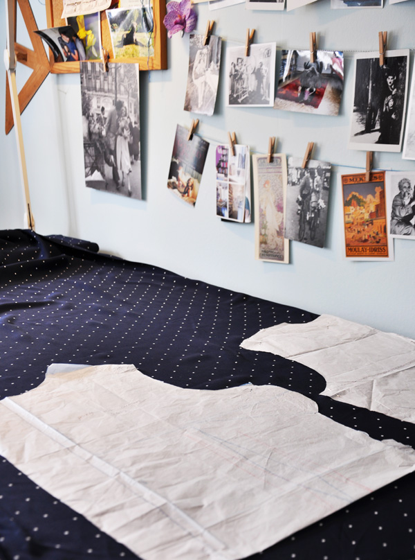 /Today I worked from home and I had the time to lay out the fabric for my new sewingproject. a 40s inspired dress in a navy rayon with small white polkadots. I’ve been craving to sew in this fabric for a long time and I’m happy to finally do it. Rayon is a favorite of mine and of course polka dots is too. I had some new cards on my inspirationalwall, I purchased them in Gothenburg the other weekend in a nice bookstore in the old parts of Gothenburg. The grey dog in the picture is my old Great Dane, the one I had before the current one. He was a sweetie, with his floppy ears and his babyblanket that he loved suck on and nibble on. I still miss that old dog even though it’s years since he passed. Of course the iconic vouge picture from 1955 gets to hang on my wall…. And last but not least, a little sewing tip. For slinky and thin fabrics it’s much easier to use a roller cutter instead of scissors. Just make sure not to cut any fingers and stay on the cutting mat so the blade don’t get dull./