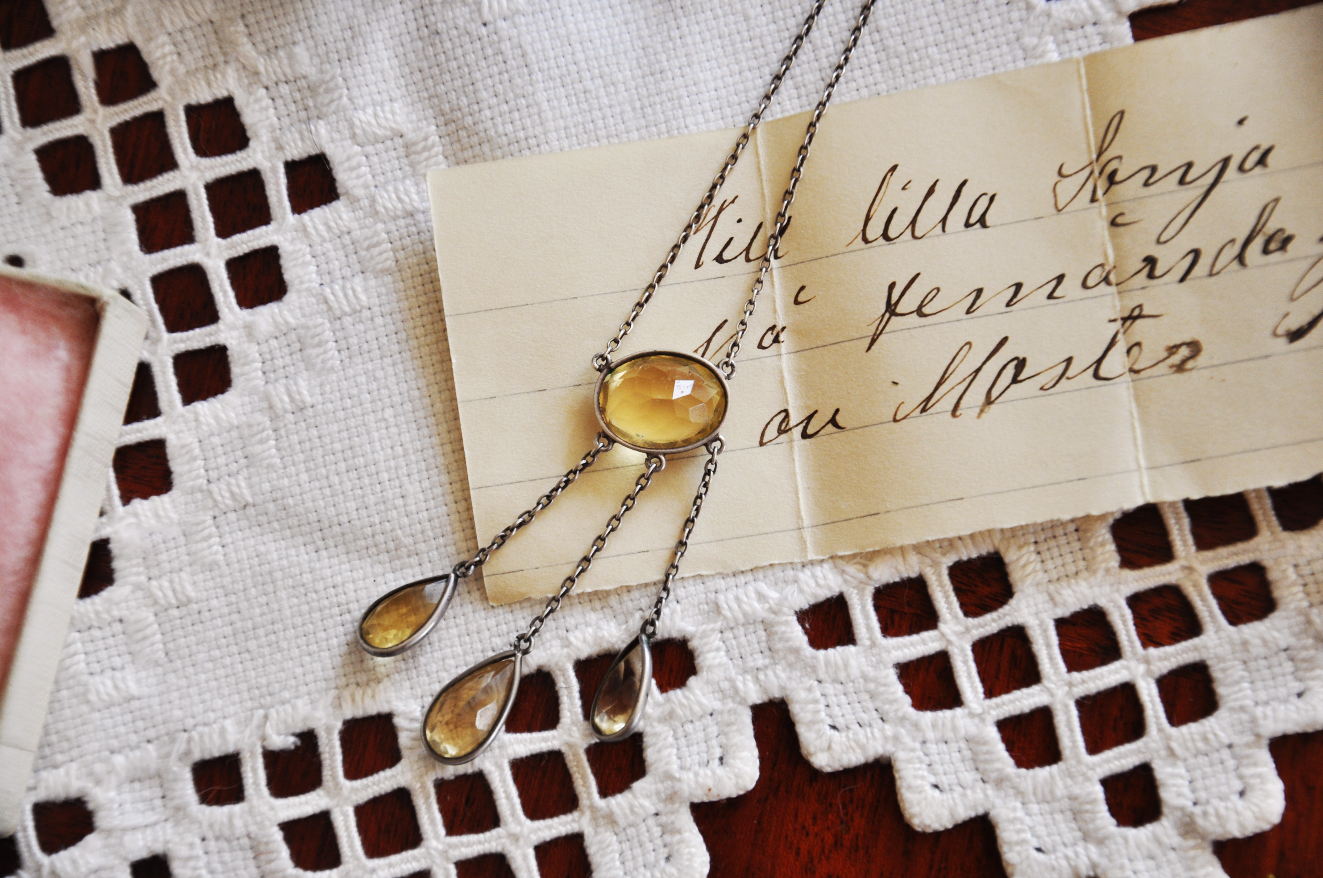 /I love things with a history and yesterday when we visited aunt Sonja she gave me the most wonderful presents. The first is a butterflybroach that was the thing all girls wished for in the later years of the 40s. She of course wished for one too and eventhough her family wasn’t wealthy by no means (things where hard after the war years) her mother saved up to buy her the brooch. The next thing is a necklace that was her mothers, probably a 20s or 30s piece and I just love the design of it. And so the very best thing, another necklace with citrin-stones. It was a gift to Sonja on her 5th birthday from an aunt in the family that didn’t have children of her own. She had even saved the little note that Selma wrote back in 1937. I really feel the times of past when I open up the little box and look at the lovely necklace and the little note that goes with it. Lovely!!/