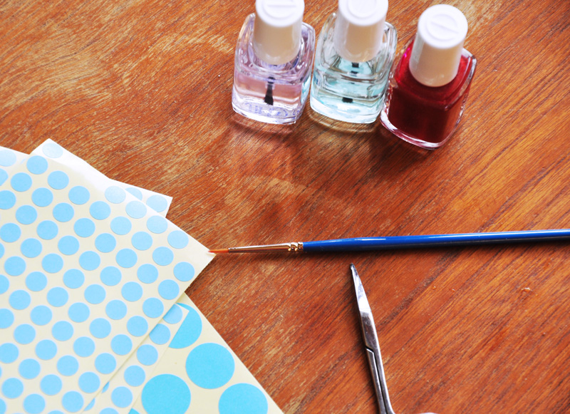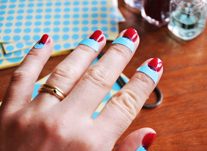 Nagellack behövs förstås, här har jag Limited Addiction från Essie och självklart är det både baslack och överlack som gäller (jag använder Essie First base och Good to go) för att lacket ska hålla optimalt. För att få till den här halvmånen använder jag mig av klistermärken som man märker,  ähum, ”saker” med (de finns på närmaste bokhandel) samt en sax för att klippa klistermärkena. För att fixa de där små skavankerna som lätt händer använder jag mig av en liten pensel (köpt på Panduro) som jag doppar i nagelacksbortagningsmedel som jag sen ”suddar” bort eventuella fel-målningar.