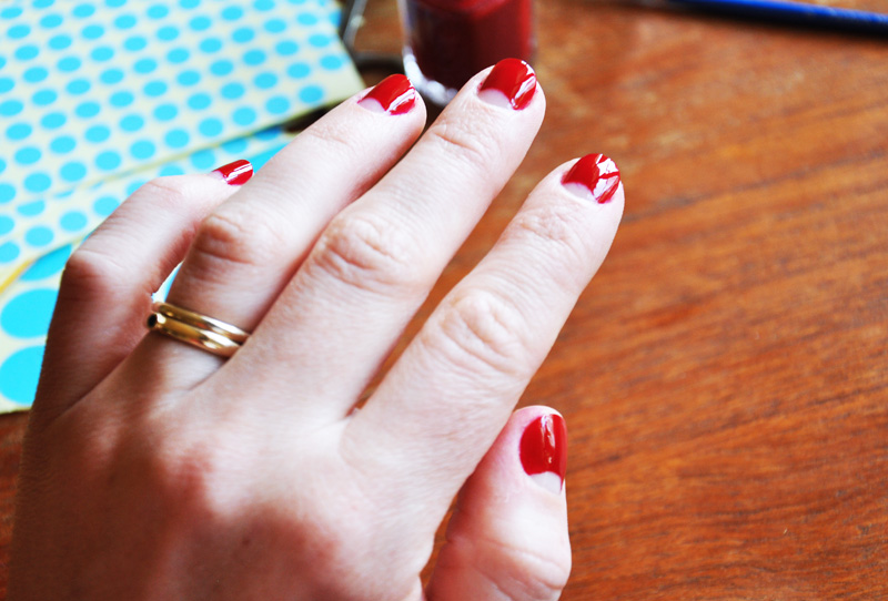 Det finns lite olika alternativ, antingen kan man ju köra med underlack sedan ett hudfärgat lack som färg för halvmånarna. Den här gången valde jag att ta min naturella färg på nageln, så det räckte det med två lager rött nagellack efter underlacket. Jag tar bort klisterremsorna innan det sista lagret stelnat helt. Man får vara lite försiktig och får man inte tag på klistermärkena kan det vara smart att ta en pincett till hjälp. Så till sist avslutar man med ett lager överlack och sen är det färdigt. Ganska tjusigt tycker jag. Även på mina stackars händer som varit och grävt i rabatterna och haft sig under helgen som gick. Det kanske är att föredra att göra den här manikyren på lite längre naglar, men jag var sugen på lite nytt och kunde inte vänta helt enkelt.