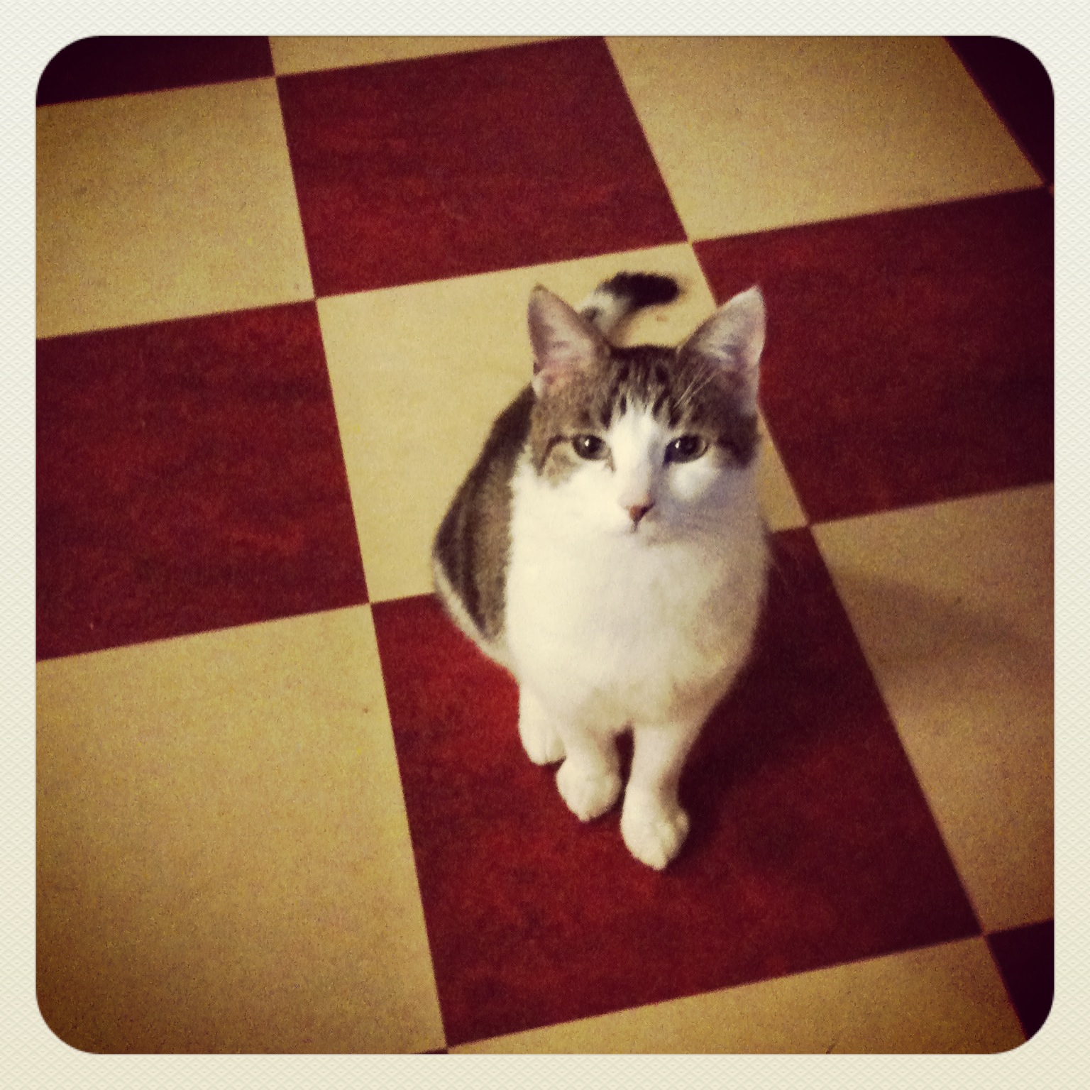 Såhär brukar det se ut bredvid oss när vi sitter och äter kvällsmat i köket. Är det inte katten vi har till bords är det hunden. Man skulle kunna säga att de arbetar i skift.