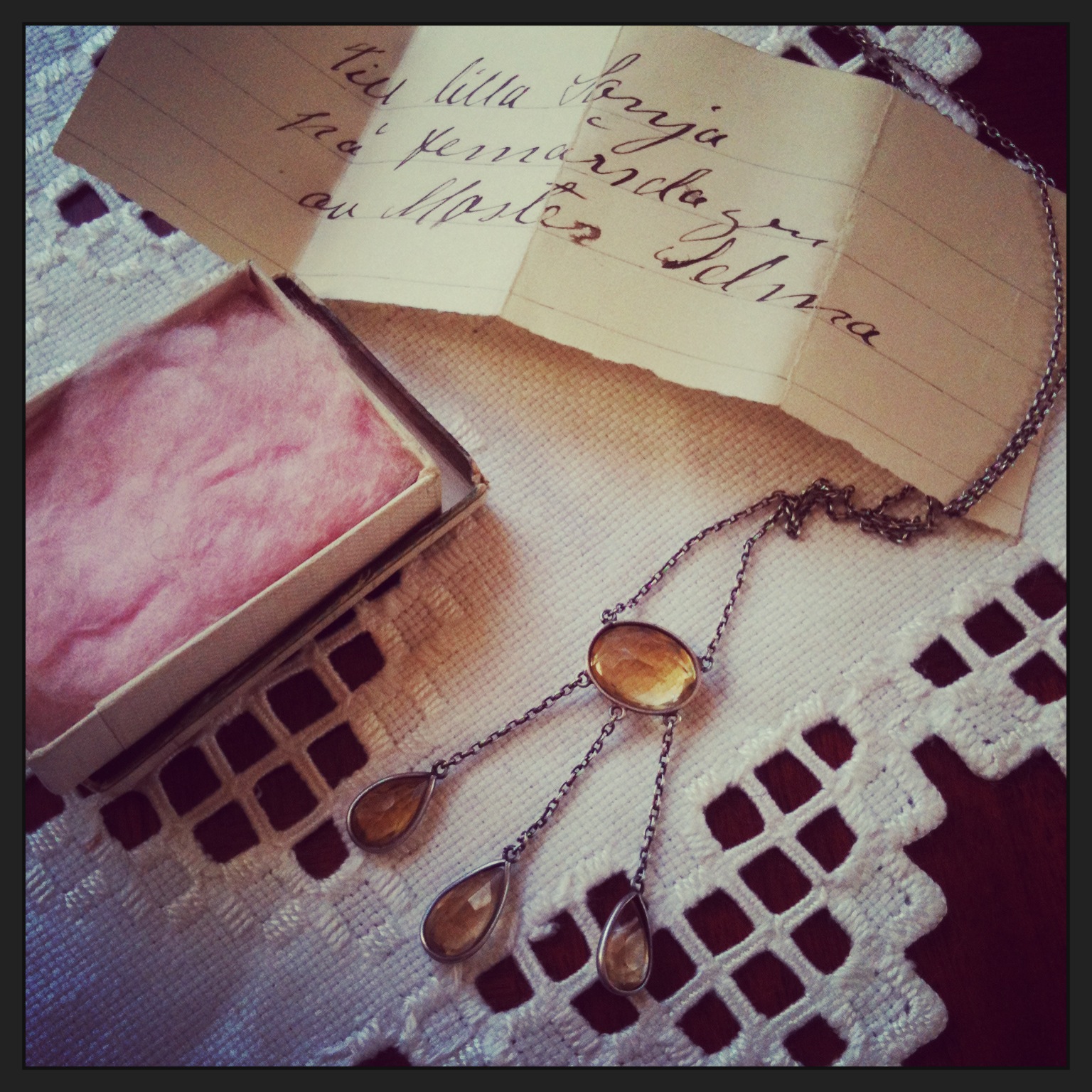Jag lyckades hitta de perfekta knapparna till min nysydda blå klänning (ska skriva inlägg om den snart) och så förstås de fina 30-tals halsbandet jag fick av tant Sonja.